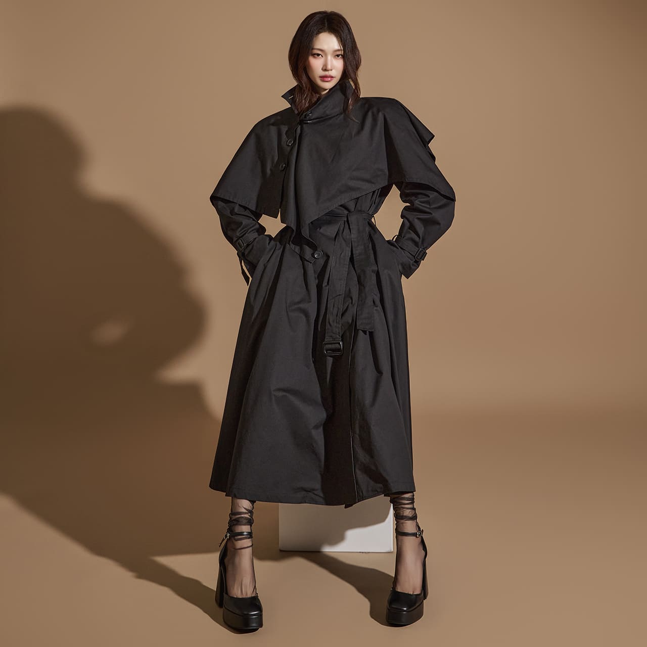 between a classic trench mood and a distinctive cape style.